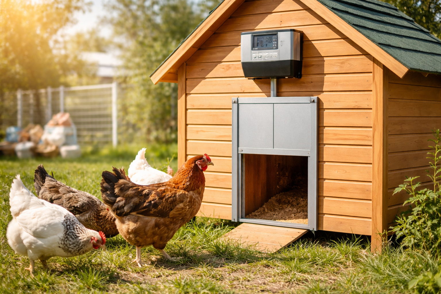 Nejpraktičtější bývá kombinace časovače a světelného senzoru. Ta umožní nastavit dvířka tak, aby fungovala spolehlivě i při změnách počasí nebo v přechodných obdobích.