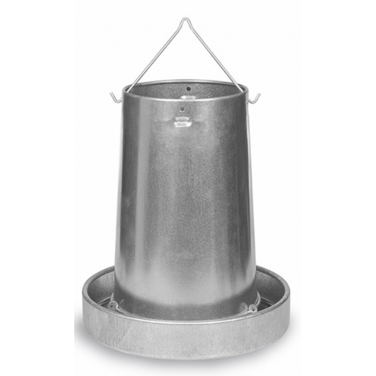 Krmící automat pro drůbež - plechový 20 kg - pro kuřata, slepice, krůty a další drůbež. Pozinkovaný plech, lze zavěsit či postavit, včetně háčku pro zavěšení. Průměr 405 mm, výška 470 mm.