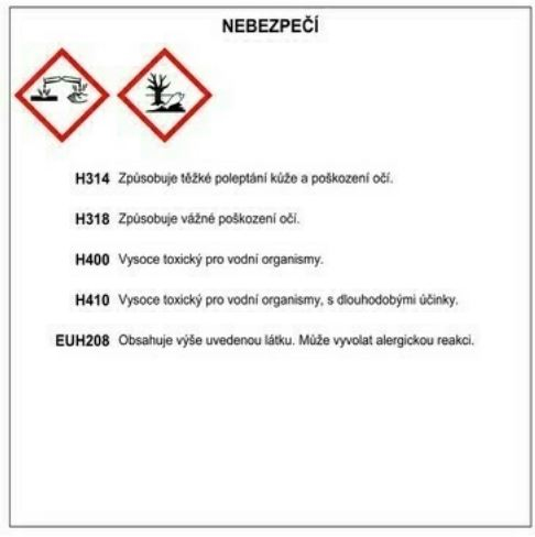 Nebezpečí: Toxický pro vodní organismy, s dlouhodobými účinky. Způsobuje těžké popálení kůže a poškození očí. Zabraňte uvolnění do životního prostředí. Uchovávejte mimo dosah dětí. Nevdechujte aerosoly. Odstraňte obsah/obal jako nebezpečný odpad.