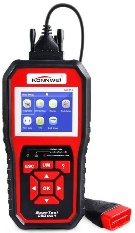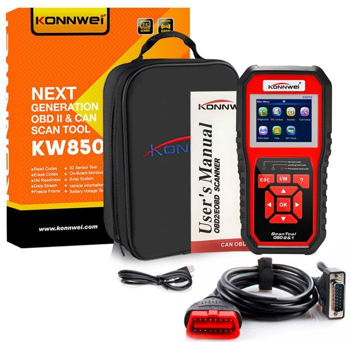 Ruční autodiagnostika Konwei KW850 umožňuje rychlou a přehlednou diagnostiku vašeho vozidla. Diagnostika umožňuje čtení a mazání chybových kódů (DTCs), Dokáže vypnout kontrolku upozorňující na kontrolu motoru (MIL) a určit poruchu. Zobrazuje živý přenos dat (například aktuální otáčky, napětí, rychlost, nebo třeba teplotu motoru). Kontrola poruchy týkající se emisí auta (Freeze Frame Data). Kontrola I/M připravenosti, která určuje, zdali auto vyhovuje americkým standardům emisí. Umožňuje získat identifikační číslo vozidla (VIN) a kalibrační čísla vozidla (CIN a CVN).