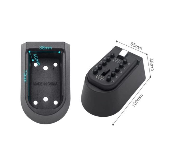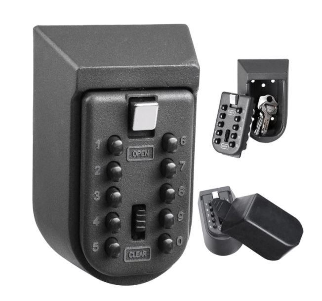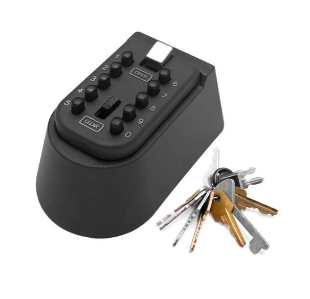 Bezpečnostní schránka na klíče se zámkem s deseti tlačítky, které lze kombinovat v řádu tisíců hesel. Jednoduše zevnitř resetovatelné číselné heslo. Pro upevnění na stěnu. Velmi odolný litinový obal.