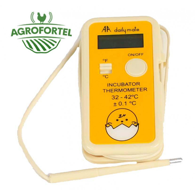 Pokrývá rozsah 32 až 43 stupňů Celsia a obsahuje kabelový senzor umožňující, aby byl displej mimo inkubátor.Malý přepínač vám umožňuje přepnout z Celsia na Fahrenheita. Baterie jsou součástí balení.