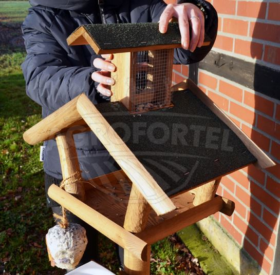 Úžasné ptačí krmítko Ptačí farma bude jistě ozdobou Vaší zahrady. Je vyrobeno z kvalitního dřeva z udržitelných lesů s certifikátem FSC.