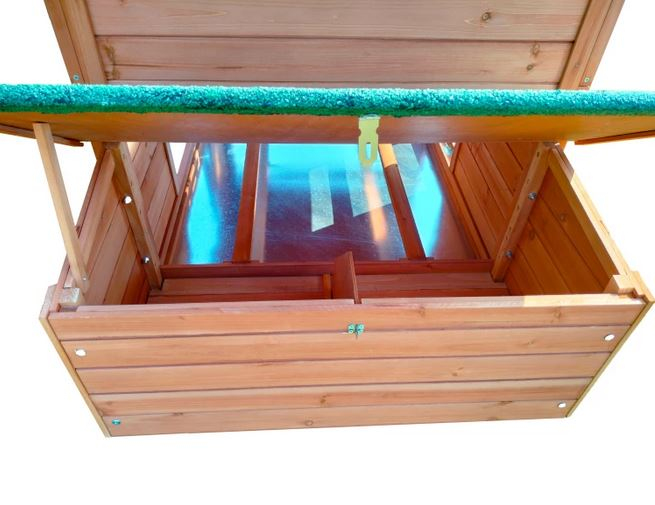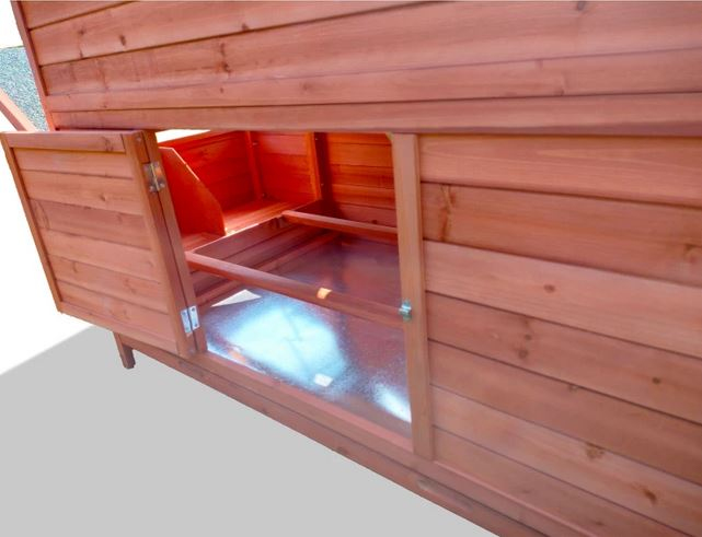 Po obou stranách naleznete hnízdící boxy, které jsou otevíratelné zvenku. Vchod do kurníku má otevírací dvířka. Nad dvířky je ventilační okno. Díky ventilačnímu oknu zajistíte Vaší drůbeži dostatečný přísun čerstvého vzduchu.