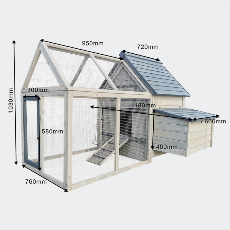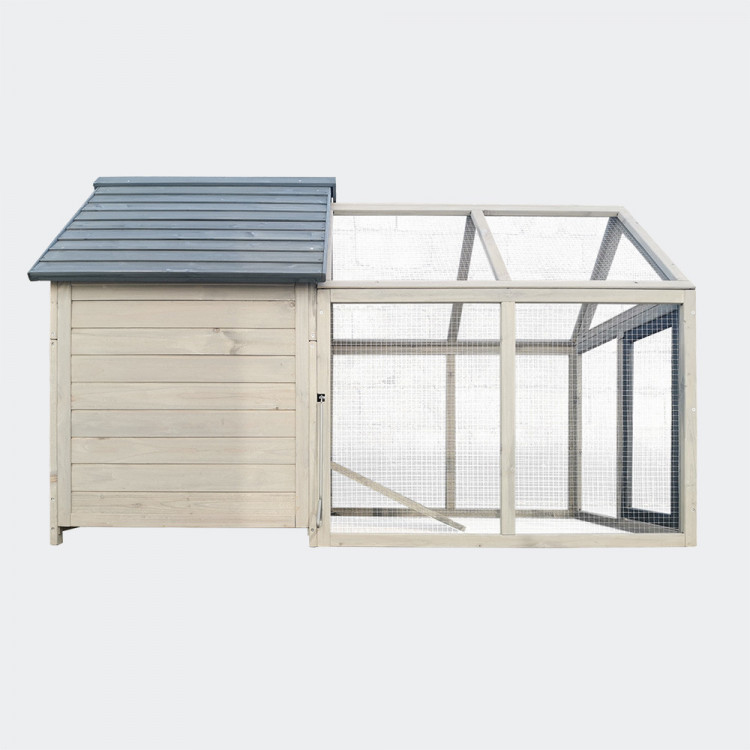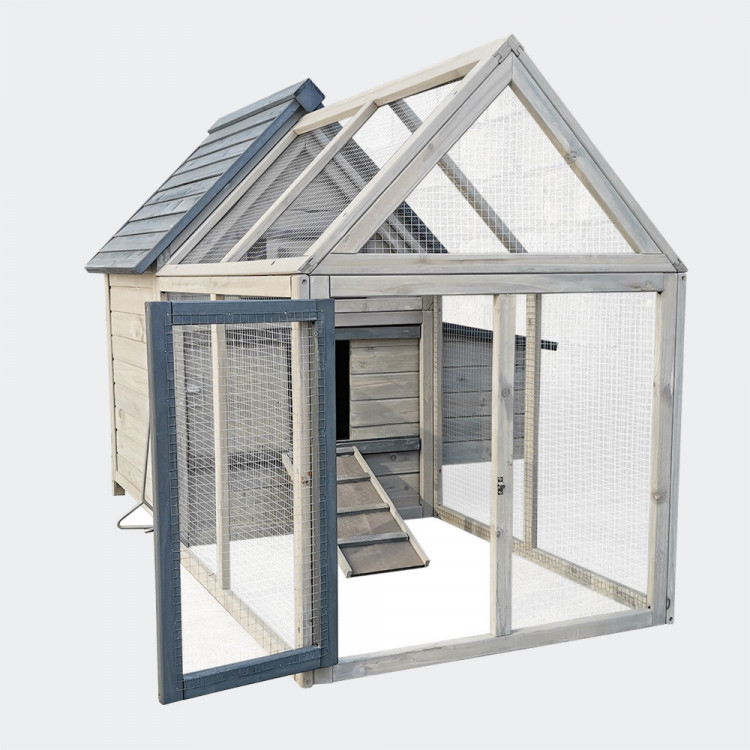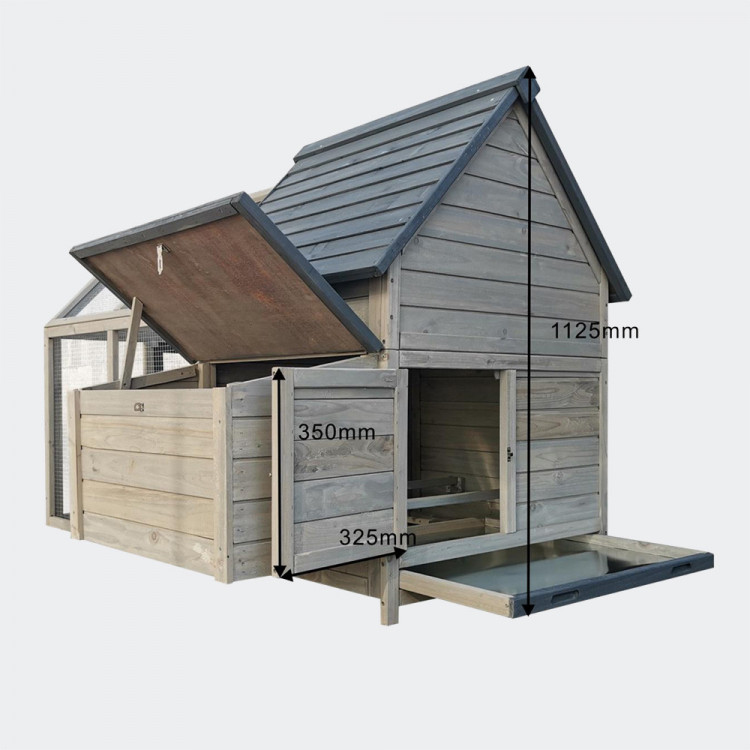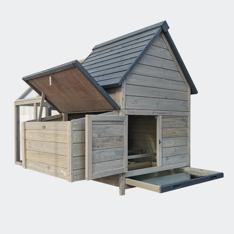 Kurník je velmi prostorný, a prostřednictvím posuvných dvířek s madlem na otevírání zvenku lze snadno oddělit výběh od vnitřních prostor.