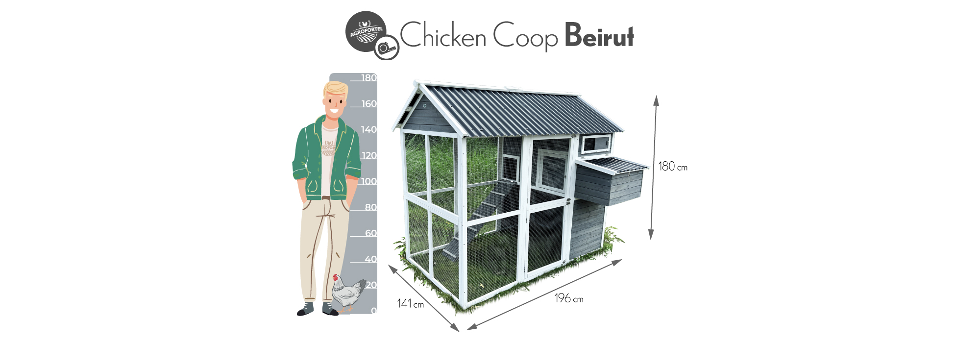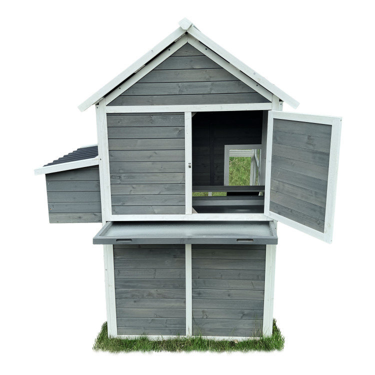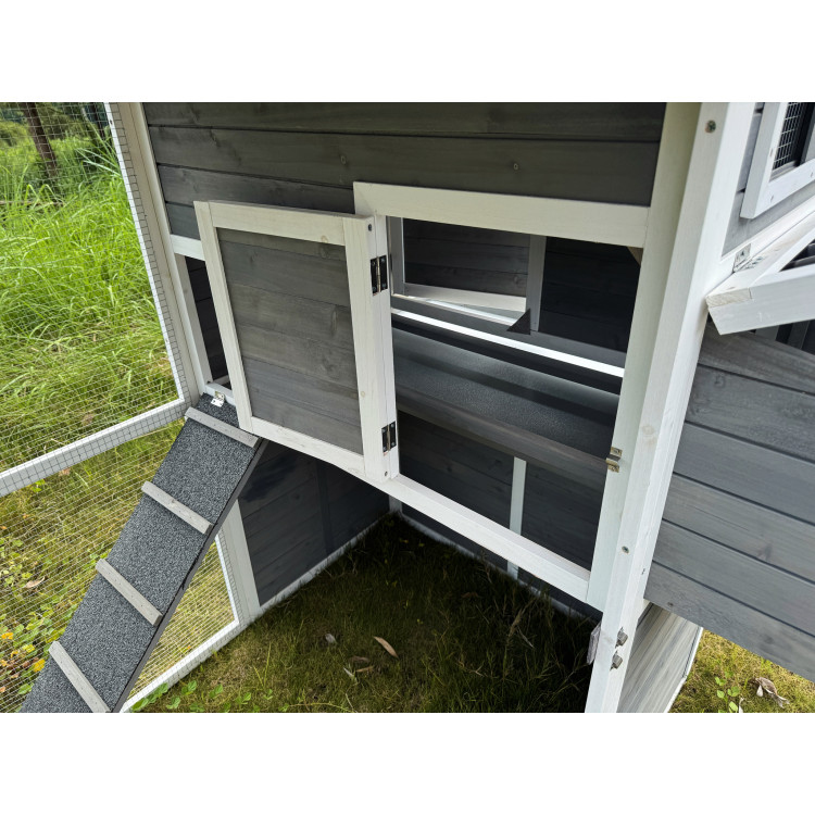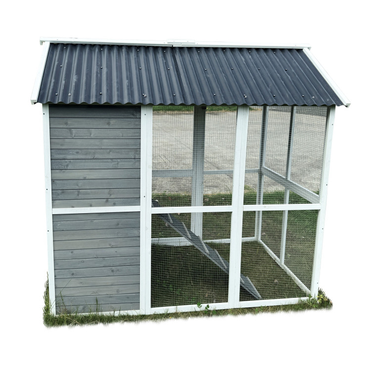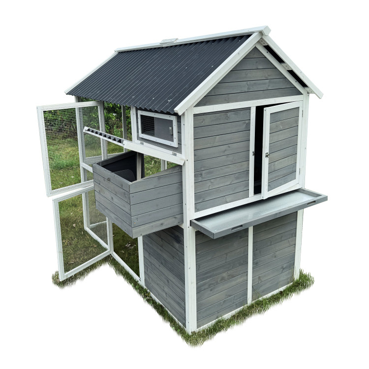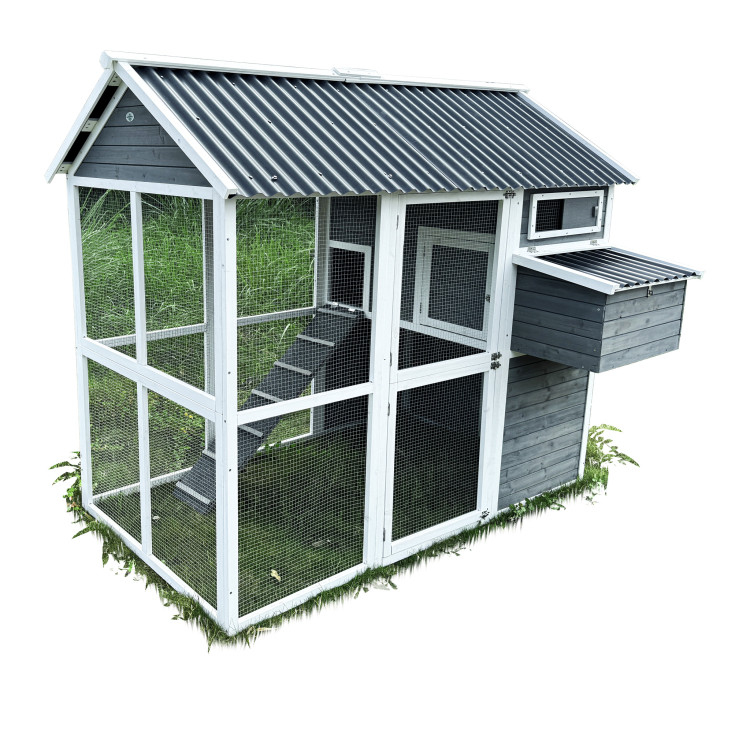 S rozměry 196 × 141 × 180 cm poskytuje domov až pro 6 slepic. Stěny kurníku jsou z masivního dřeva v kombinaci šedé a bílé barvy, materiál střechy je vlnitý plast, který zcela bezpečně chrání před deštěm, sněhem i horkým sluncem. Součástí je také velký oplocený výběh z pozinkovaného pletiva, kde mají slepice dostatek prostoru k pohybu na čerstvém vzduchu a trávě.Uvnitř kurníku se nachází hřad pro noční odpočinek, rampa spojující obytnou část s výběhem a boční snáškové hnízdo s výklopnou střechou pro snadný sběr vajíček.Snadnou údržbu zajišťuje výsuvný trusník (výsuvná podlaha). Zdraví vašich slepiček prospěje ventilační okénko s pletivem, které zajišťuje přístup čerstvého vzduchu, který je pro správné životní podmínky zcela nezbytný.Přístup dovnitř kurníku je snadný díky velkým dvířkům na přední i zadní straně a bočním dveřím do výběhu.