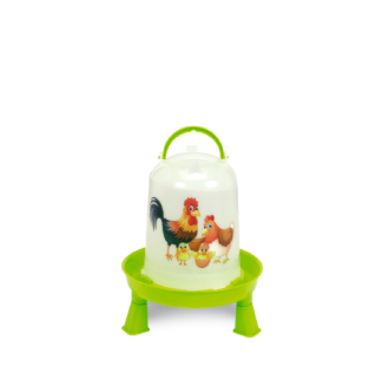 Napáječka pro slepice, drůbež 5 l GAUN závěsná s nožičkami HAPPY RANGE. Napáječka sbajonetovým uzávěrem - plastová napáječka závěsná pro kuřata, slepice, krůty, husy, kachny a další drůbež z odolného plastu - polypropylen, snadno se čistí.Napáječka se skládá ze čtyř dílů: napájecí miska, 3 nožičky, zásobní klobouk, ucho na zavěšení