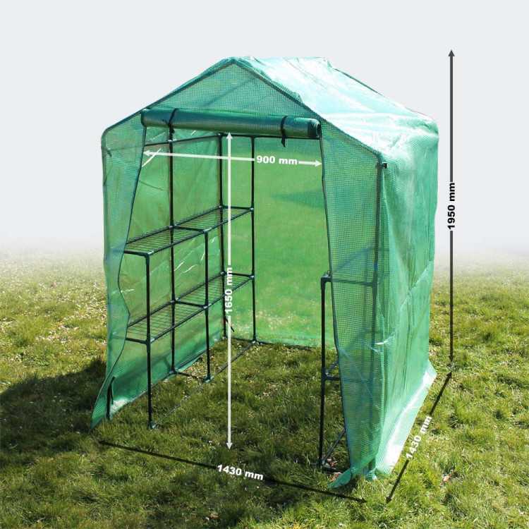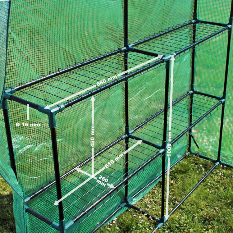 Tento skleník nabízí dostatek prostoru pro více rostlin díky velkorysým rozměrům 143 x 143 x 195 cm. Přední část se tak může otevírat a zavírat pomocí zipu, což umožňuje vstup do skleníku, aniž by rostliny příliš trpěly nepříznivými povětrnostními podmínkami.Uvnitř skleníku se nachází 8 polic. Kovové police poskytují dostatek prostoru pro správné umístění květináčů i zahradního nářadí.