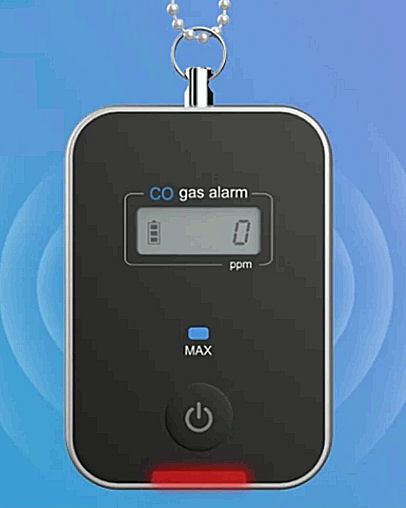 Přenosný detektor oxidu uhelnatého s vestavěným alarmem.