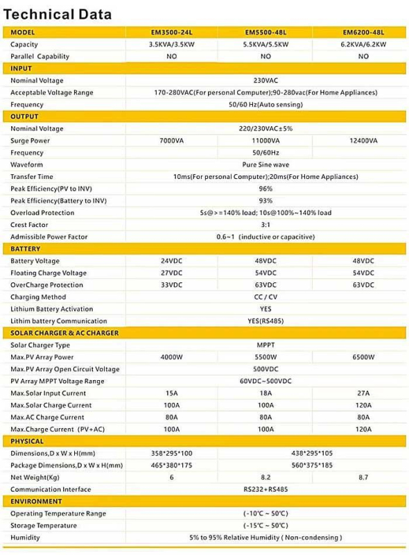 Hybridní měnič napětí EM3500-24L, DC/AC 24V/3500W,regulátor MPPT