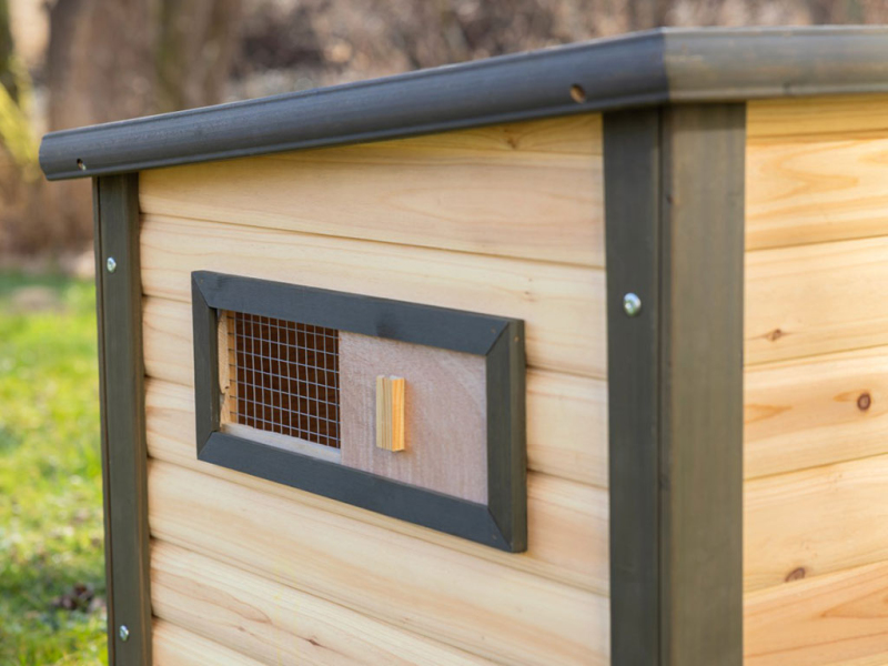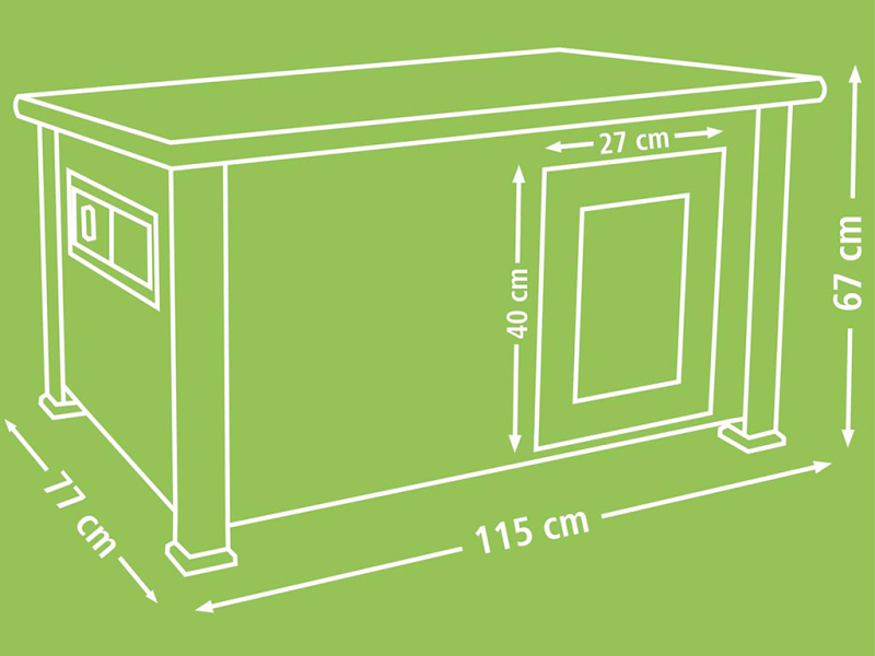 Vnější rozměry celého kachníku jsou 115x77x67 cm, a tak poskytne dostatek prostoru pro vaše kachny a husy. Rozměry dvířek kachníku jsou 27x40 cm.