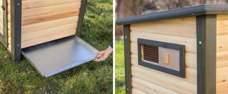 Čištění kachníku zvládnete během pár minut pomocí praktického výsuvného pozinkovaného trusníku ze strany kachníku.Cirkulaci vzduchuv kachníku zajišťuje boční posuvné okénko.