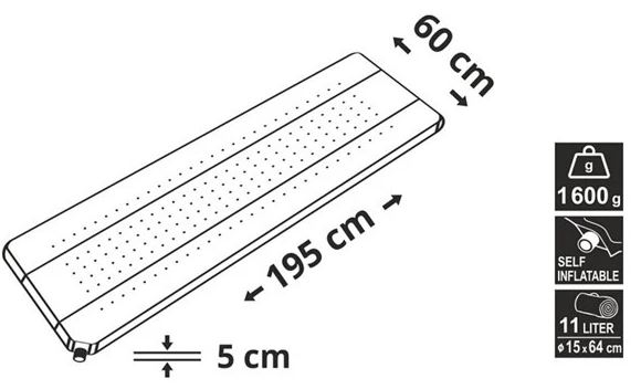 Barva karimatky je modrá s šedým pruhem. Díky délce 195 cm a šířce 60 cm je karimatka ideální i pro větší osoby. Tlouštka 6 cm navíc zaručuje vysoký komfort při použití. Balení má drobné rozměry 64 x 15 cm a hmotnost 1600 g, není tedy problém mít ho vždy u sebe jako příruční zavazadlo v přírodě.