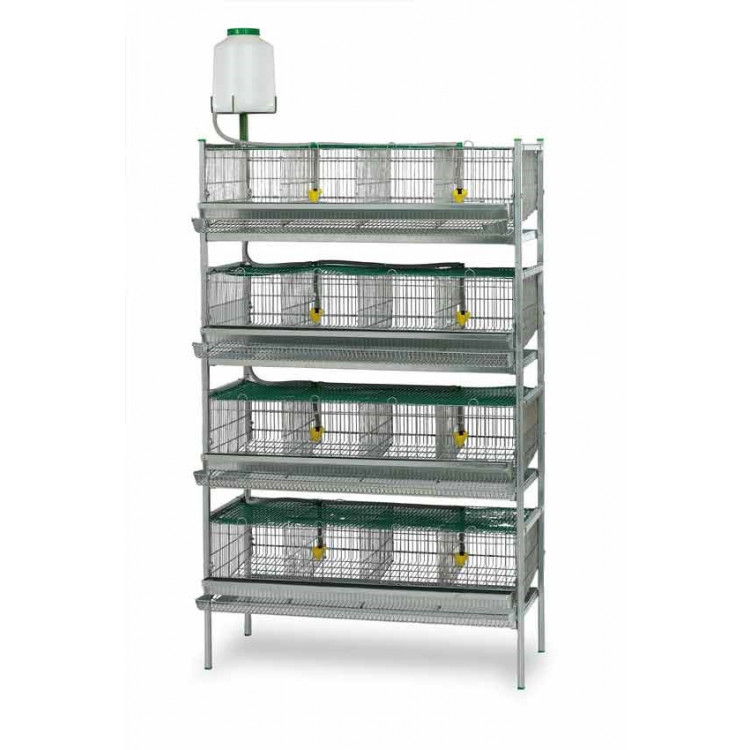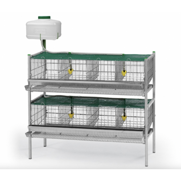Klec pro křepelky - dvoupatrová - baterie klecí pro křepelky japonské či čínské. Součástí je korýtko na krmivo, automatická napáječkami s hadičkou, filtrem a tankem na vodu 8,5 l.
