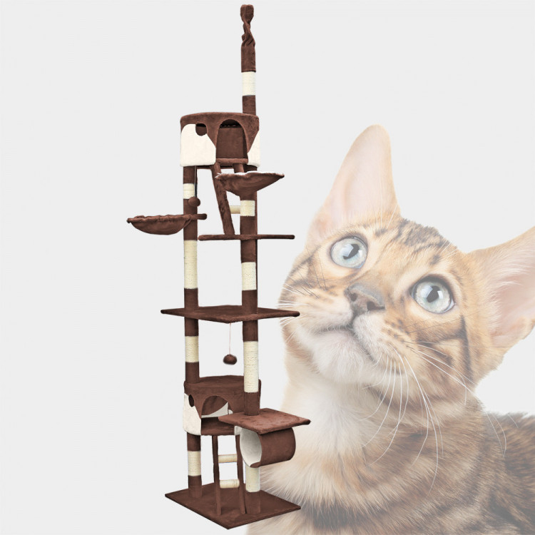 Toto kočičí škrabadlo nabízí několik míst k odpočinku a také možnosti útočiště. S výškou 240 – 260 cm a kombinací několika plošin a jeskyní se tento kočičí strom dokonale hodí do domácností s mnoha kočkami. Jeho výška je variabilní, protože horní sisalový kus lze upravit tak, aby vyhovoval podmínkám vašeho domova, což umožňuje zvýšit stabilitu kočičího stromu jeho sevřením mezi podlahu a strop. Ale i bez toho, základní deska 45 x 60 cm již poskytuje konstrukci bezpečný stojan a zajišťuje, že ji mohou kočky používat bez rizika.