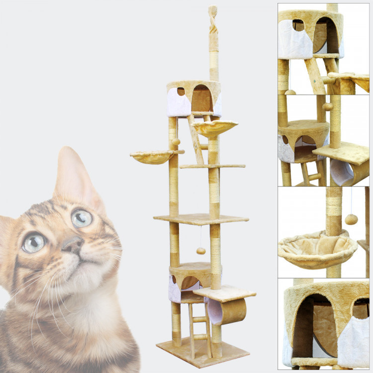 Toto kočičí škrabadlo nabízí několik míst k odpočinku a také možnosti útočiště. S výškou 240 – 260 cm a kombinací několika plošin a jeskyní se tento kočičí strom dokonale hodí do domácností s mnoha kočkami. Jeho výška je variabilní, protože horní sisalový kus lze upravit tak, aby vyhovoval podmínkám vašeho domova, což umožňuje zvýšit stabilitu kočičího stromu jeho sevřením mezi podlahu a strop. Ale i bez toho, základní deska 45 x 60 cm již poskytuje konstrukci bezpečný stojan a zajišťuje, že ji mohou kočky používat bez rizika.