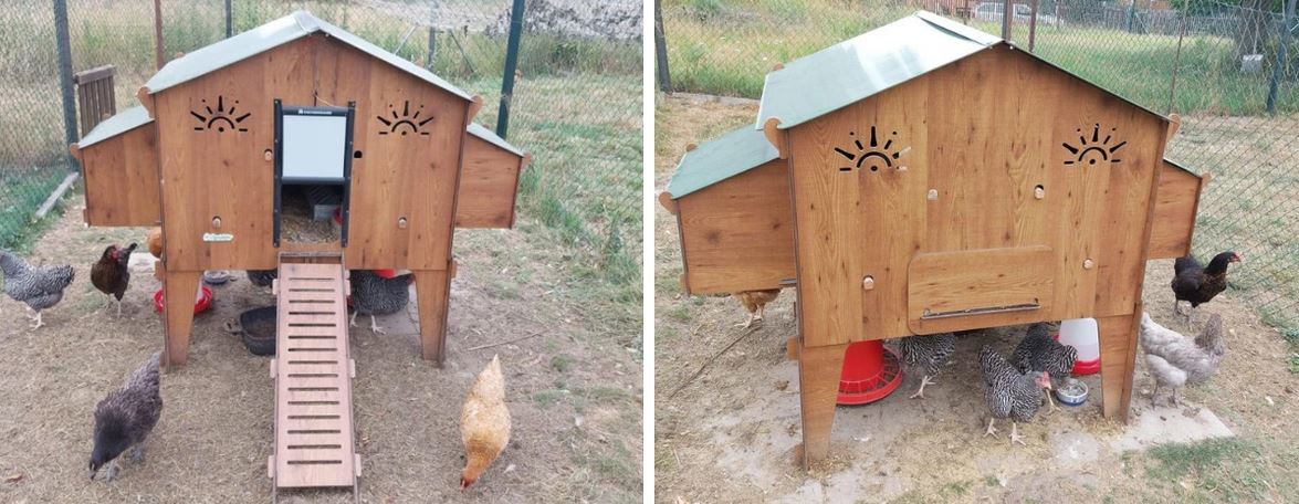 Kurník pro slepice je vybaven čtyřmi hřady pro noční odpočinek slepic. Součástí kurníku jsou také čtyři vnější kukaně, v kterých budou mít slepice dostatek prostoru a klidu pro snášení vajec. Získávání vajíček přitom bude velice jednoduché, jelikož k jejich vyzvednutí stačí pouze zvednout střechu snáškových hnízd. Díky tomu, že je kurník vyvýšen na nožkách 50 cm od země, tak poskytuje slepicím i během dne ochranu před sluncem či deštěm. Tento prostor pod kurníkem je ideální k umístění napáječek a krmítek. Do kurníku mají slepice během dne pohodlný přístup přes žebřík. Součástí balení jsou bezpečnostní dvířka značky Chicken Guard, na které můžete v případě zájmu snadno připojit automatické otevírání kurníku (k zakoupení zde). Automatické otevírání a zavírání kurníku není součástí balení!