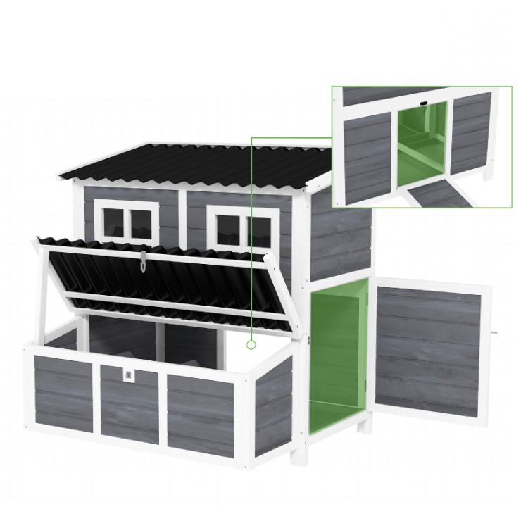 Díky dvěma vstupním dveřím a rampě mohou slepice volně a bezpečně přecházet mezi kurníkem a venkovním prostorem. Vnitřní hřady poskytují komfortní místo pro odpočinek a spánek, zatímco okna zajišťují dostatek světla a umožňují kontrolu hejna bez zbytečného rušení. Kurník je vyroben z kvalitního masivního jedlového dřeva a ošetřen voděodolným nátěrem, který prodlužuje jeho životnost. Vyvýšené provedení chrání konstrukci před vlhkostí od země a zlepšuje cirkulaci vzduchu. Plastová střechapak poskytuje spolehlivou ochranu proti dešti a nepříznivému počasí.