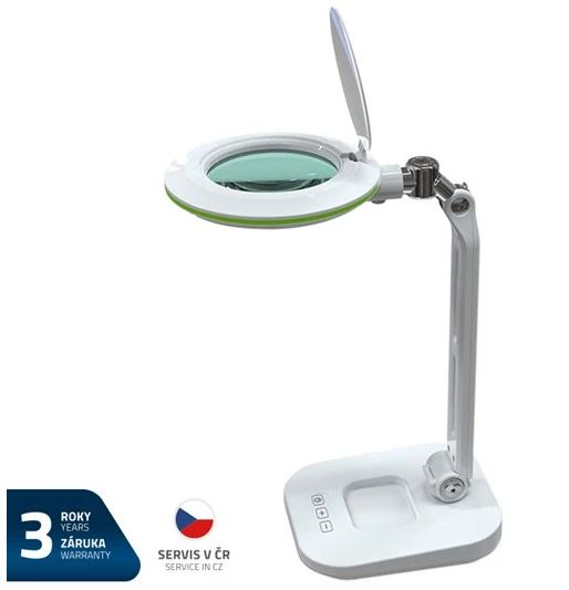 Kvalitní skleněná čočka (3 dioptrie) je vhodná pro jemnou práci. Lupa je vybavena krytem čočky a dlouhým ramenem pro velký rozsah pohybu. Výhodou této lupy je možnost plynule měnit jas světla (stmívač) pomocí dotykových ovládacích tlačítek a přizpůsobit tak osvětlení přesně podle Vašich potřeb.