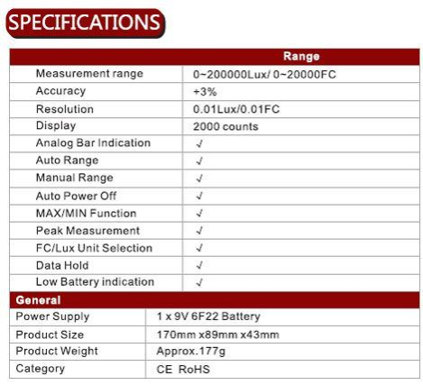 - Měření plošné intenzity světla=Lux (lm/m2) nebo (lm/ft2) Rozsah 0–200000Lux nebo 0–20000ftc