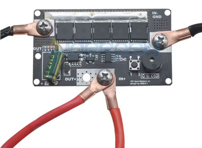 Připojte baterii ke svorkám +IN a -IN. Kladný pól je společný s +OUT. Na -OUT a+OUT připojte svařovací elektrody.