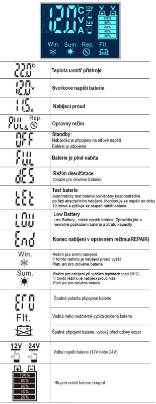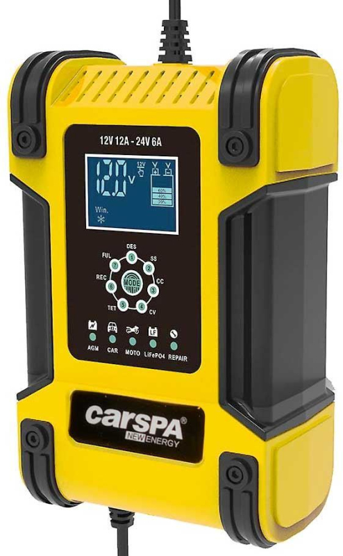 Chytrá, plně automatická nabíječka Pb a LiFePO4 baterií proudem do 12A umožňující trvalé propojení s nabíjenou baterií. Je vybavená programem pro regeneraci Pb baterií. 7stupňové nabíjení .
