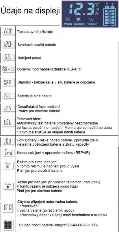 1) Připojte nabíjenou baterii k přívodním svorkám nabíječky.To se projeví akustickým signálem (pípnutím) a rozsvícením displeje. Na displeji je údaj svorkového napětí akumulátoru.