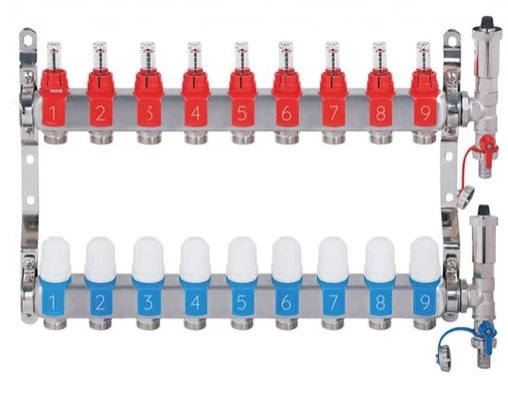 Nerezový rozdělovač hranatý - 9-cestný - průtokoměry, termostat. ventily, automat. odvzd. ventily, připojení 1" závit