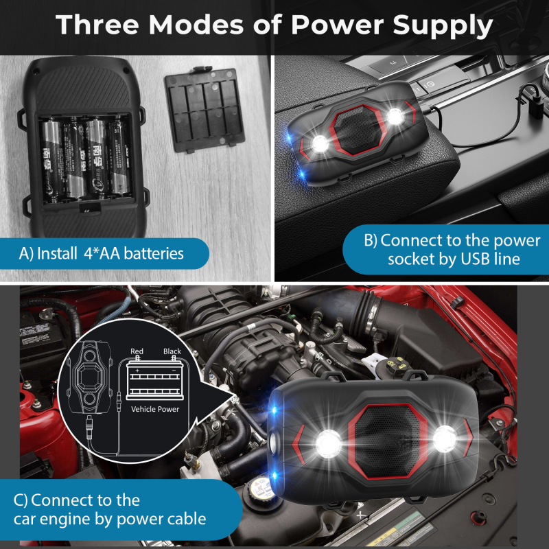 Zařízení je možno napájet ze zásuvky 230V pomocí jakékoliv USB-C nabíječky (není součástí balení), pomocí kabelu z 12V připojení k baterii ve voze, tak i z 4x AA tužkových baterií může se využít např. na půdách či jiných prostorech bez možnosti napájení.