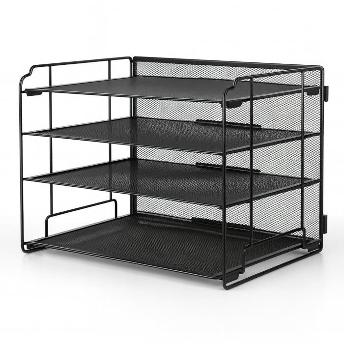 Tento černý kovový organizér na stůl je praktickým řešením pro ukládání dokumentů a kancelářských potřeb. Pomáhá udržovat vaše pracoviště uklizené a lépe organizované. Díky 4 prostorným policím a dalšímu zásobníku budete mít všechny důležité materiály vždy po ruce.