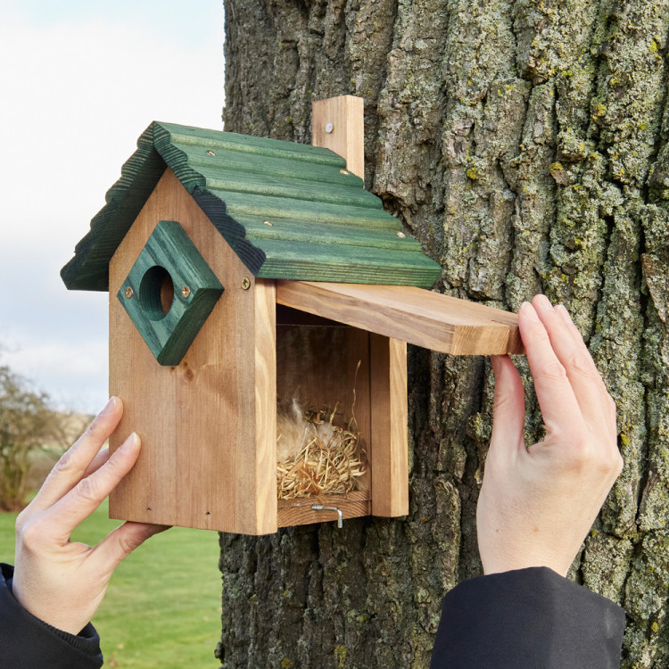 - Budka má na vnitřní straně drážky, takže mláďata mohou snadno vylézt k výstupnímu otvoru.
