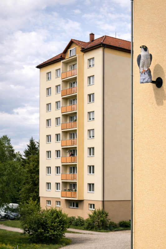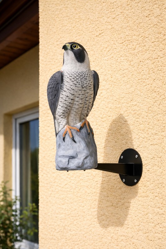 Realistická 3D maketa sokola v životní velikosti (45 cm) určená k ochraně fasád domů před poškozením ptactvem. Ideální řešení proti strakapoudům, datlům, holubům i dalším druhům ptáků, kteří narušují zateplené fasády a znečišťují budovy.