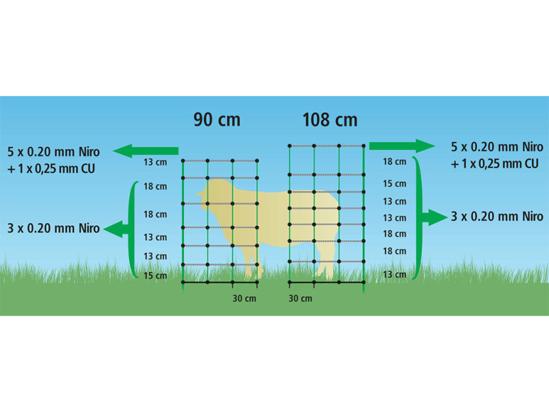 Vodivá síť je skvělým řešením pro stavbu výběhu ovcí. Umožňuje rychlé a jednoduché postavení ohrady prakticky kdekoliv, a díky své flexibilitě se snadno přizpůsobí požadovanému tvaru. Velkou výhodou je její mobilita, můžete celý výběh během chvíle přemístit na jiné místo. Síť poslouží i jako efektivní zábrana například kolem prostoru, kam nechcete stádo ovcí pouštět. Navíc je elektrifikovatelná – lze ji připojit k bateriovému zdroji a vytvořit tak bezpečný elektrický ohradník. Díky kombinaci vodivých měděných a nerezových drátů nabízí velmi nízký elektrický odpor, což zajišťuje vysokou účinnost po celé délce sítě. Zesílený horní vodič funguje jako hlavní nosič proudu a zároveň zpevňuje celou konstrukci.