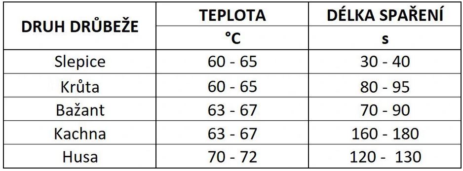 Před škubáním je nutné drůbež správně spařit viz orientační tabulka níže. Nepřekračujte teplotu a dobu ponoření drůbeže. Delší čas ponoření může způsobit vaření některých částí masa a kůže a to může způsobit při škubání problém. Uvedené časy jsou orientační a doručujeme v průběhu spaření drůbeže ručně kontrolovat možnost snadnosti škubaní peří.