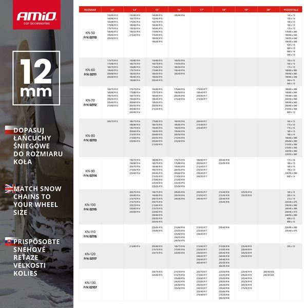 Řetěz je vyroben z kalené oceli a má asymetrický vzor ve tvaru diamantu. To zlepšuje trakci kol na zasněženém nebo zledovatělém povrchu. Pevné články jsou 12 mm vysoké a mají čtvercovýprůřez.