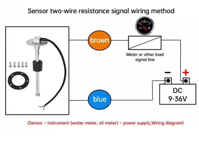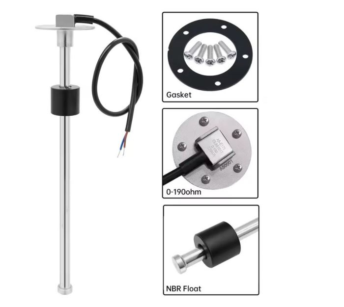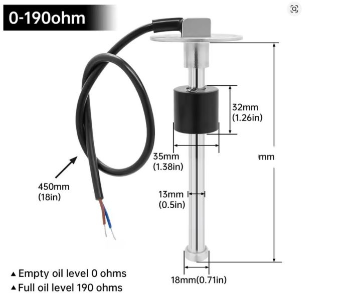 Nerezový snímač hladiny kapaliny. Při přázdné nádrži 0ohm, při plné 190ohm.
