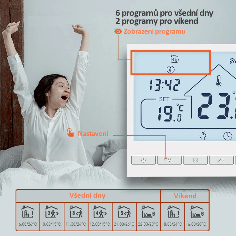 Ovládání: na termostatu nebo pomocí aplikace TUYA přes Wi-Fi pomocí chytrého telefonu z jakéhokoliv místa, kde je dostupný internet.