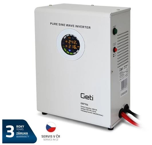 Nouzový napájecí systém GETI (EPS - Emergency Power Supply) s čistým sinusovým výstupním signálem je zařízení, které zajišťuje zdroj střídavého napětí v případě výpadku elektrické sítě. Nouzový napájecí systém můžete použít jako záložní zdroj pro různá čerpadla, automatické kotle, podavače, nouzové osvětlení, kamerové systémy a další. V normálním režimu je připojené zařízení napájeno přímo ze sítě a při výpadku se nouzový napájecí systém automaticky přepne do režimu měniče. Připojené zařízení je pak napájeno z připojené baterie. V případě, že nedojde k obnovení dodávek elektrické energie, může dojít k vypnutí nouzového napájecího sytému v momentě, kdy napětí připojené baterie klesne na hodnotu okolo 10,2V ± 0,3V. Je to z důvodu ochrany baterie před hlubokým vybitím a následným poškozením. EPS je vybaven přehledným barevným displejem, měničem napětí s čistým Sinusem založeném na toroidním transformátoru a rychlým 32-bit procesorem.