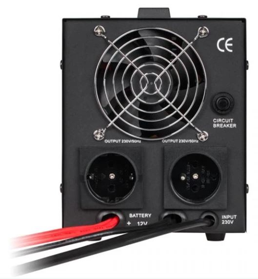 - Jako nouzový napájecí zdroj s funkcí nabíjení převádí 12V DC dodávané z externí baterie do elektrické sítě 230V AC a dobíjí externí baterii.