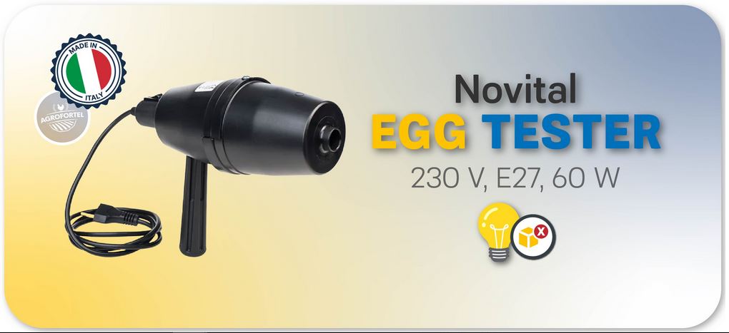 Představujeme Vám italskou zkoušečku vajec Novital s příkonem 230 V. Jedná se o optický přístroj pro kontrolu oplozenosti vajec. Pomocí této zkoušečky můžete sledovat vývoj embryjí ve vejcích. Umožňuje snadno kontrolovat vývoj embryí uvnitř vajec a včas odstranit neoplozená nebo nevhodná vejce. Zařízení vytváří koncentrovaný světelný paprsek pomocí žárovky (není součástí balení) – 230 V, 60 W, závit E27. Osvětlením vejce lze pozorovat jeho vnitřní strukturu.