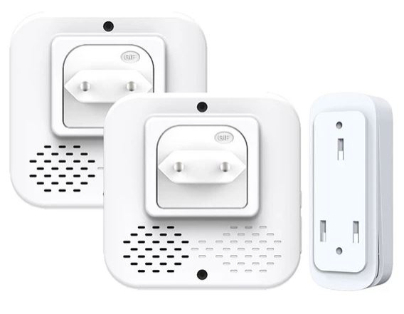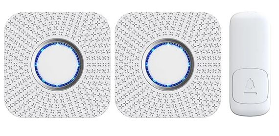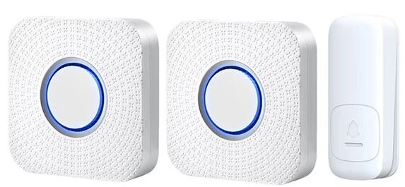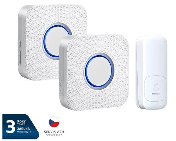 Součást balení: 2 zvonky, 1 tlačítko, návod, 2 šroubky, 2 hmoždínky, šroubovák