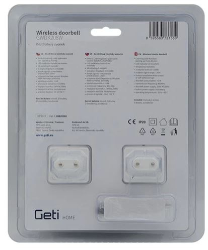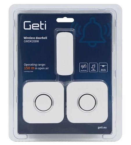 Na tento výrobek poskytujeme 3 roky záruku. Sada 2 domovních zvonků a 1 tlačítka GETI GWDK208W se hodí nejen k domu či bytu, ale také do kanceláří, továren či recepčních hal. Hlavní výhodou je, že tlačítko nevyžaduje žádné baterie ani externí napájení, protože energii potřebnou k jeho provozu generuje samotný pohyb stisknutí tlačítka. Tím se eliminuje nutnost pravidelné výměny baterií, což je ekologické a úsporné řešení. Velkou předností tohoto zvonku je také jeho bezdrátové provedení s dosahem až 150 m ve volném prostoru. Instalace zvonku je velmi snadná, spárování mezi vysílačem a zvonkem probíhá automaticky. Funkce LEARNING CODE navíc umožnuje vzájemné spárování více tlačítek a zvonků. Zvonek má jednoduchý moderní design, 5 stupňů hlasitosti a výběr z 58 vyzváněcích melodií. Velkou výhodou zvonku je zapamatování si nastavené melodie a hlasitosti i po odpojení přístroje od elektrické sítě.